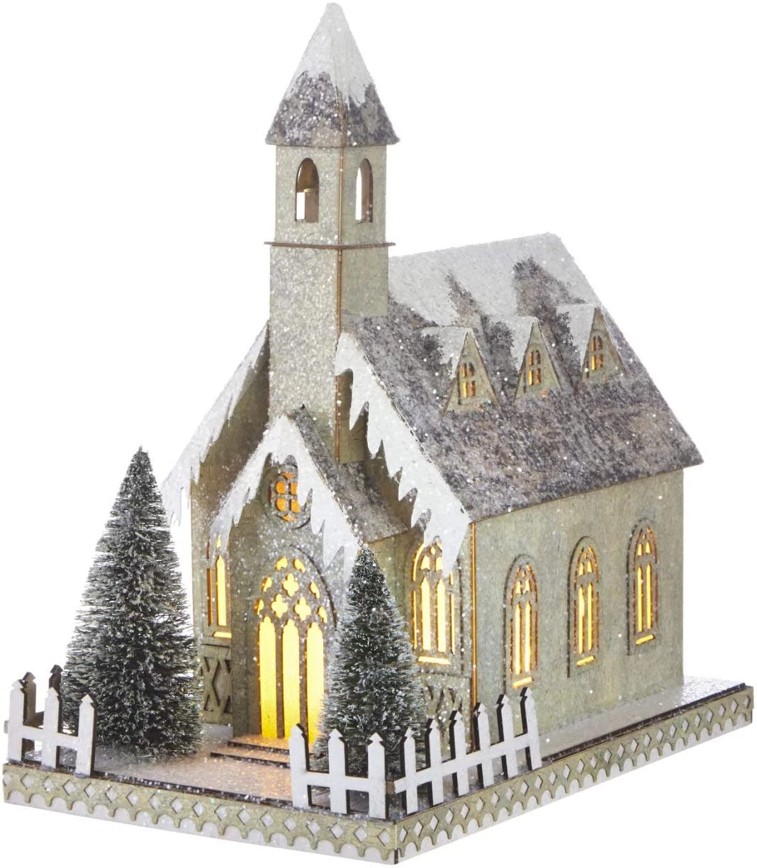 - GREAT VINTAGE FARMHOUSE STYLE – Cardboard church features a snow and glitter-covered roof and steeple and LED lights shining from the windows. Lights run on a timer to turn on and off automatically each evening.