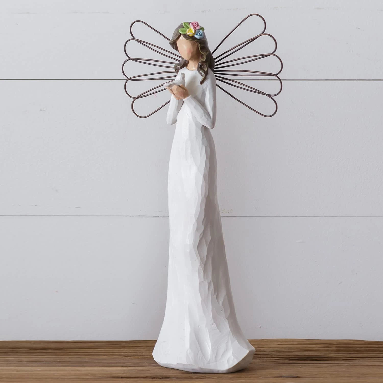 - PERFECT TABLETOP DECOR – This charming angel figurine with flowers in her hair gently holds a sweet dove. She will lift your spirits when displayed above your fireplace, on your kitchen counter or bookshelves
