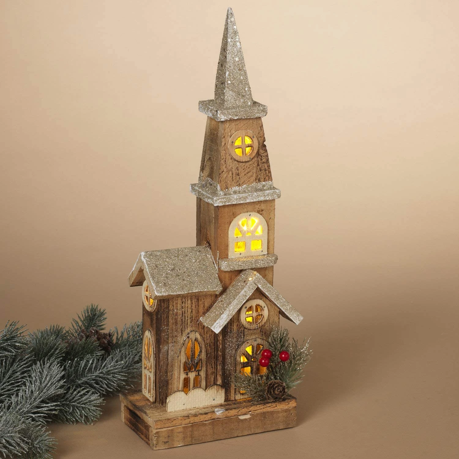 - This holiday decoration is a country-style primitive wooden church with glittery steeple and rooftop and various window and door cut outs that light up from the inside. A pine accent completes the farmhouse style of this Christmas decoration.
