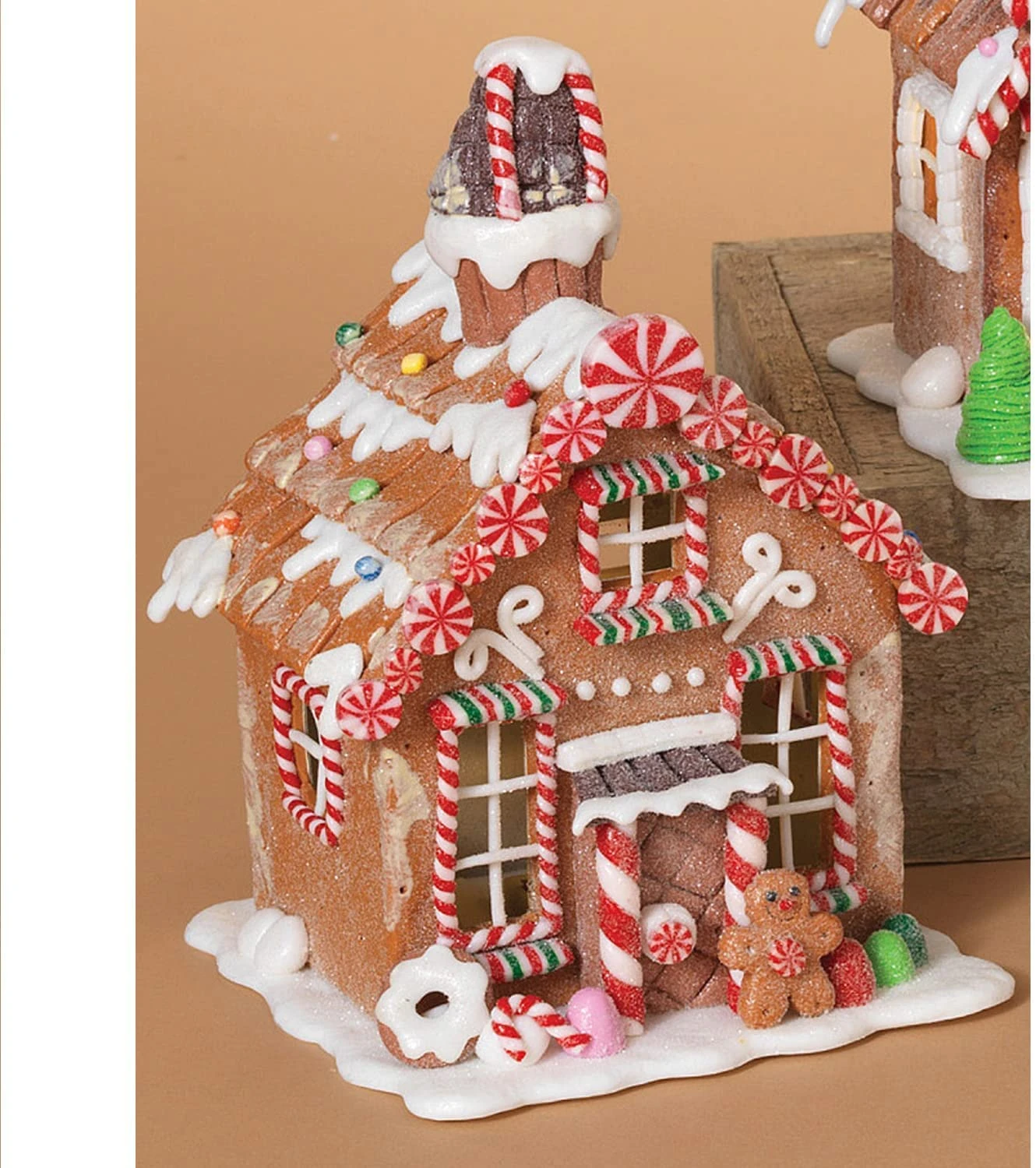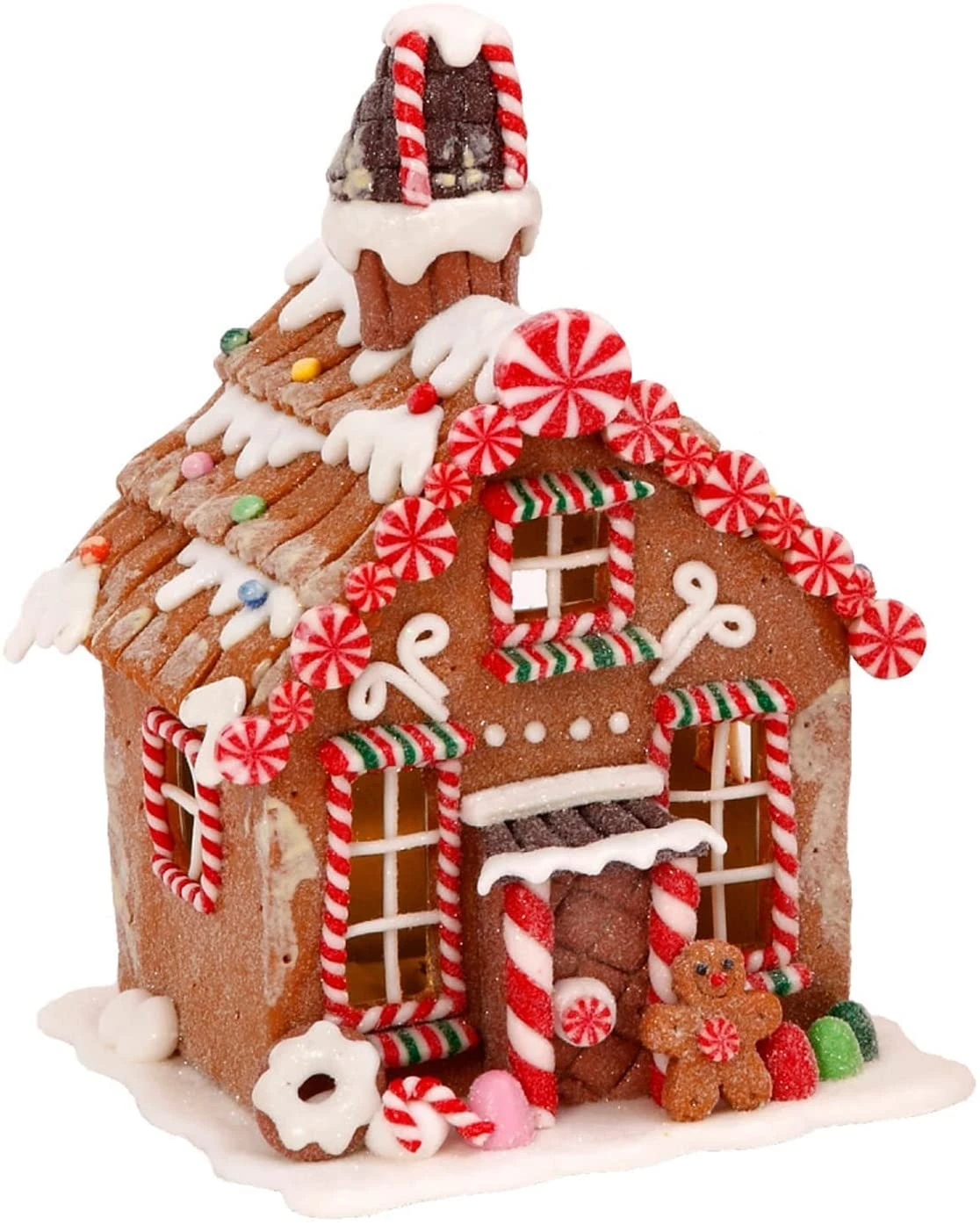- 7-INCH LIGHTED GINGERBREAD HOUSE with peppermint candy accents is a classic and nostalgic addition to any holiday home decor, and is a fun Christmas decoration that the whole family will enjoy