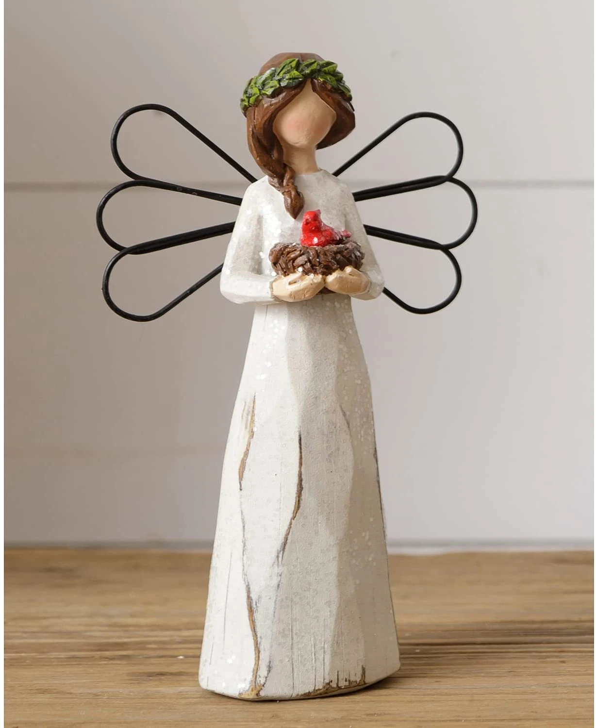 - PERFECT TABLETOP DECOR – This charming angel figurine with her evergreen crown and cardinal in a nest is sure to lift your spirits displayed above your fireplace, on your kitchen counter, bookshelves, or desk