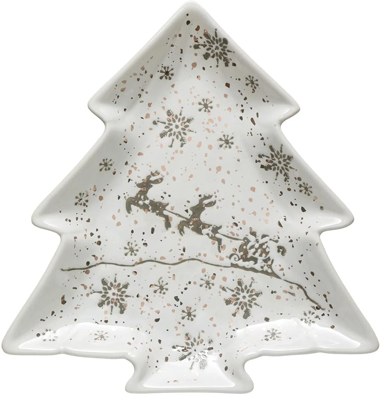 9.5-Inch White, Silver And Gold Hand-Stamped Stoneware Christmas Tree Shaped Plate With Snowflake Pattern, Santa Sleigh, Reindeer Design – Decorative Party Dish Tray Tableware
