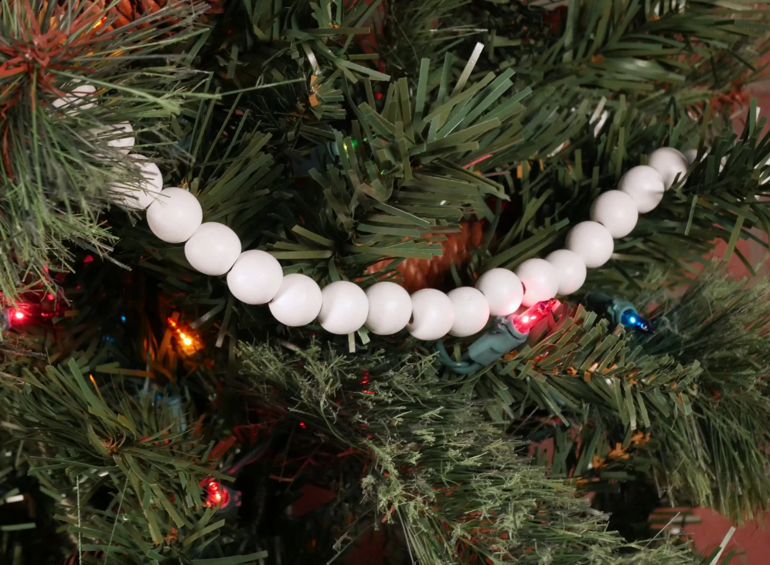 - 9-FOOT MATTE WHITE WOOD BEAD GARLAND features 1/2-inch matte white wooden beads. Measures 108 inches long