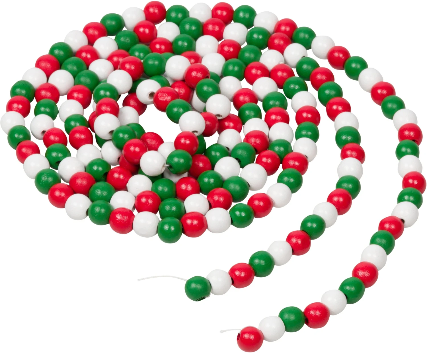 - 9-FOOT RED WHITE AND GREEN WOOD BEAD GARLAND features 1/2-inch bright red, green, and white wooden beads in a shiny finish. Measures 108 inches long