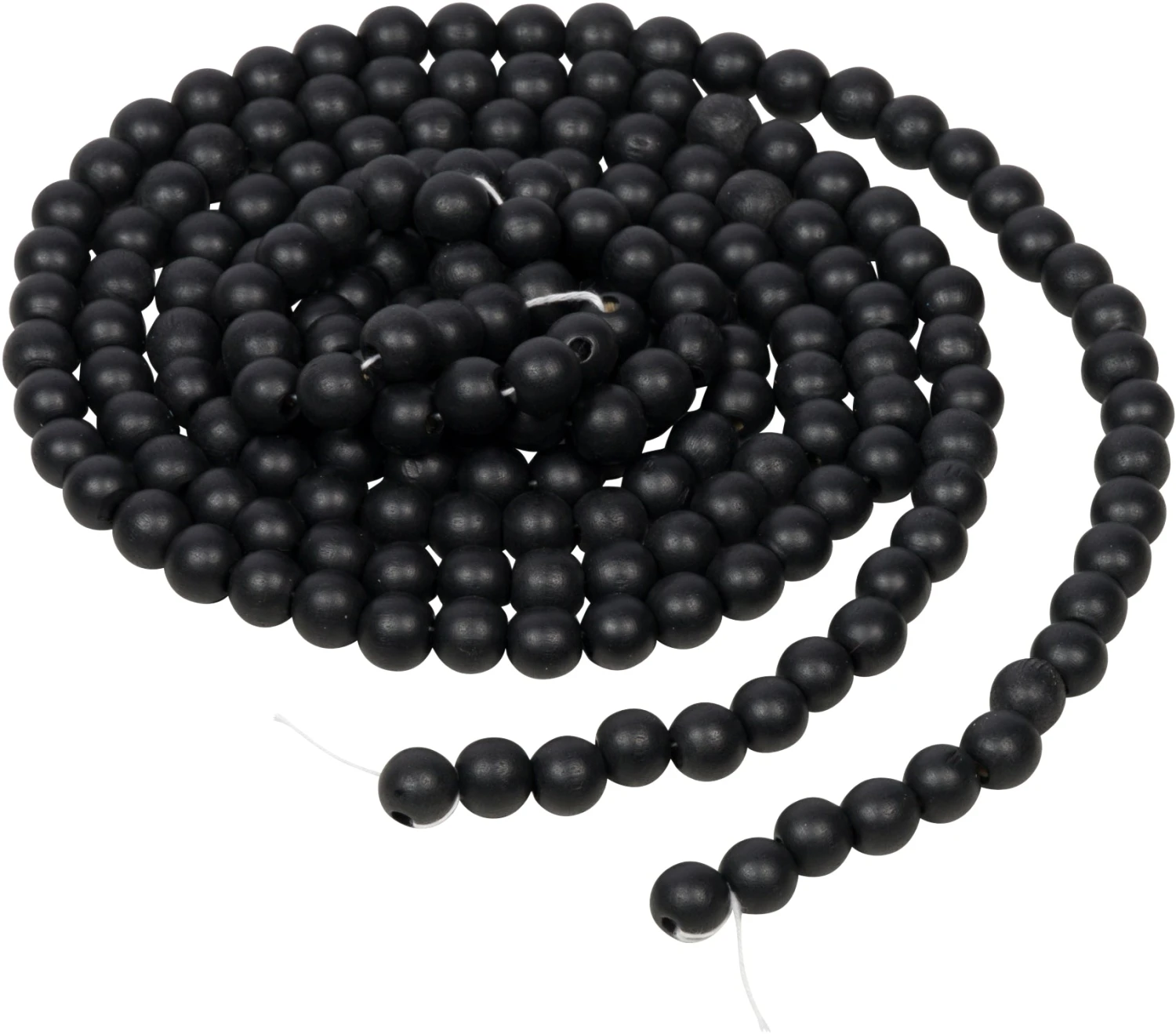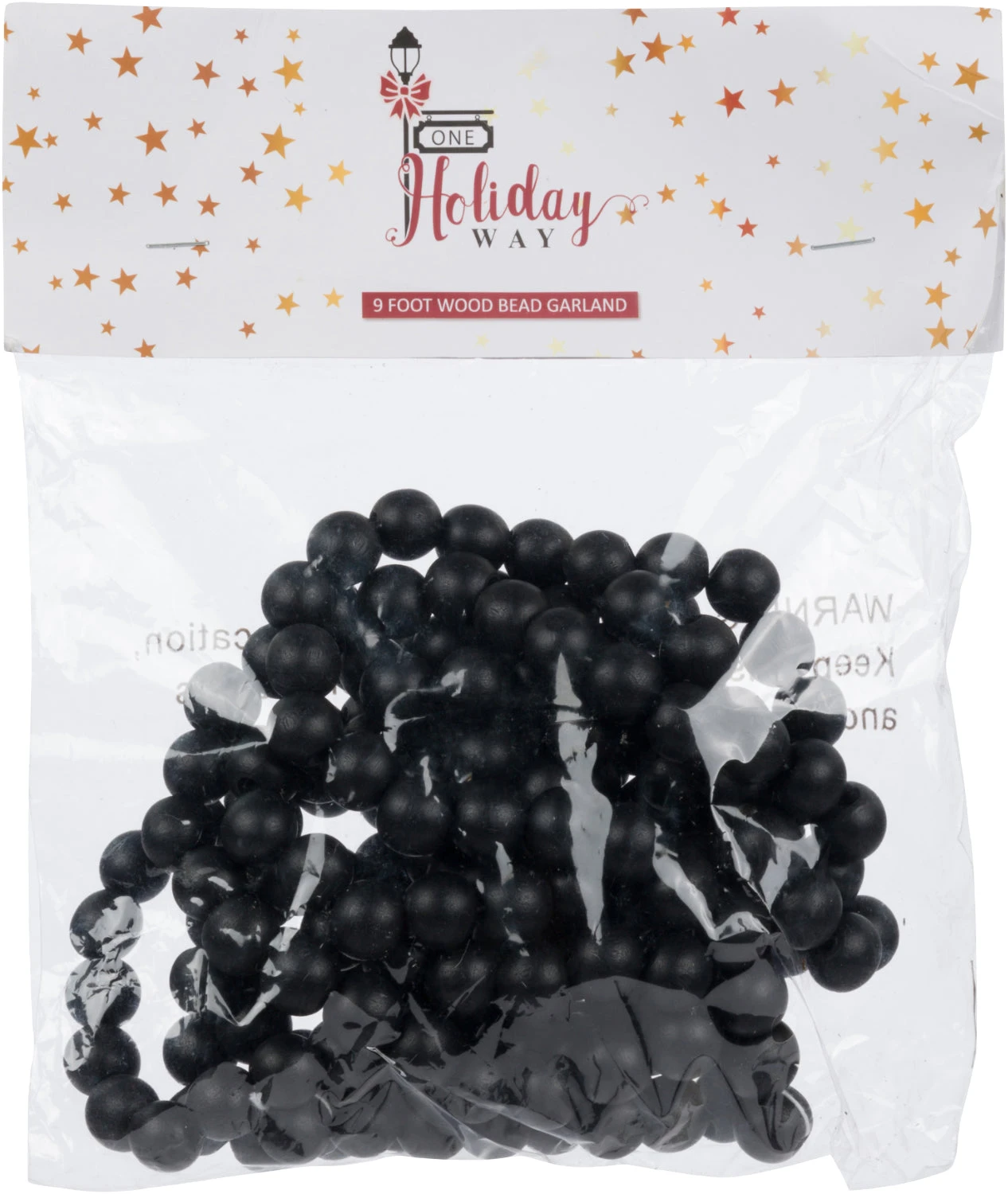 - 9-FOOT MATTE BLACK WOOD BEAD GARLAND features 1/2-inch wooden beads in a neutral matte black color. Measures 108 inches long
