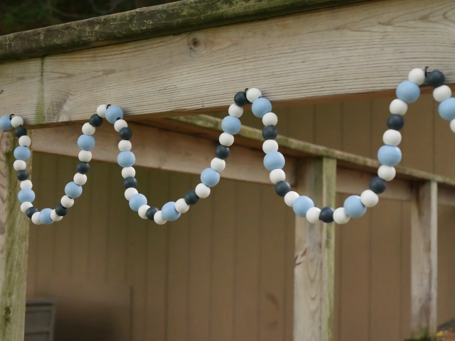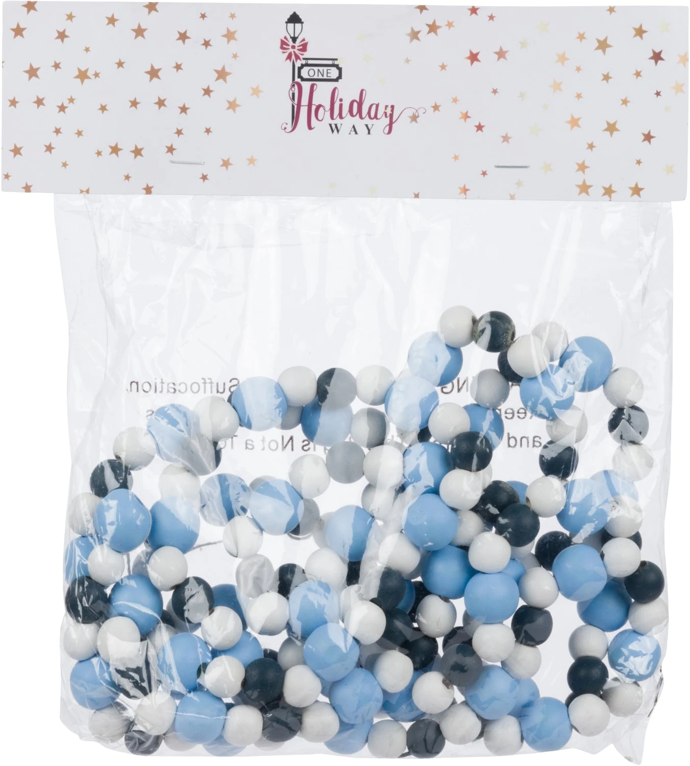 - 9-FOOT BLUE AND WHITE WOOD BEAD GARLAND features 3/4-inch wooden beads in a light baby blue, and 1/2-inch wooden beads in dark navy blue and white colors. Measures 108 inches long