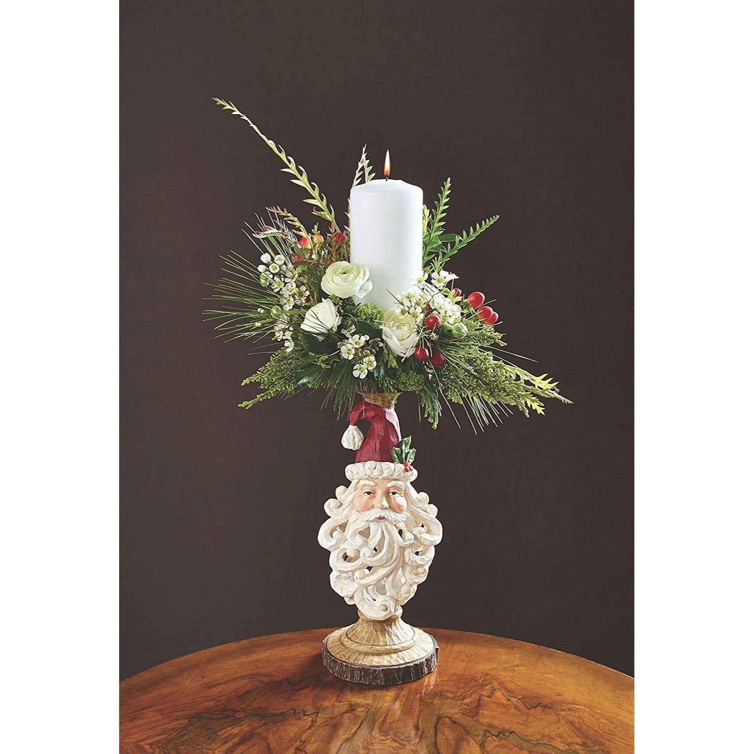 - A traditional Santa head figure makes up the stem of the candleholder. Santa has a classic white beard, rosy cheeks, and a red hat with holly detail