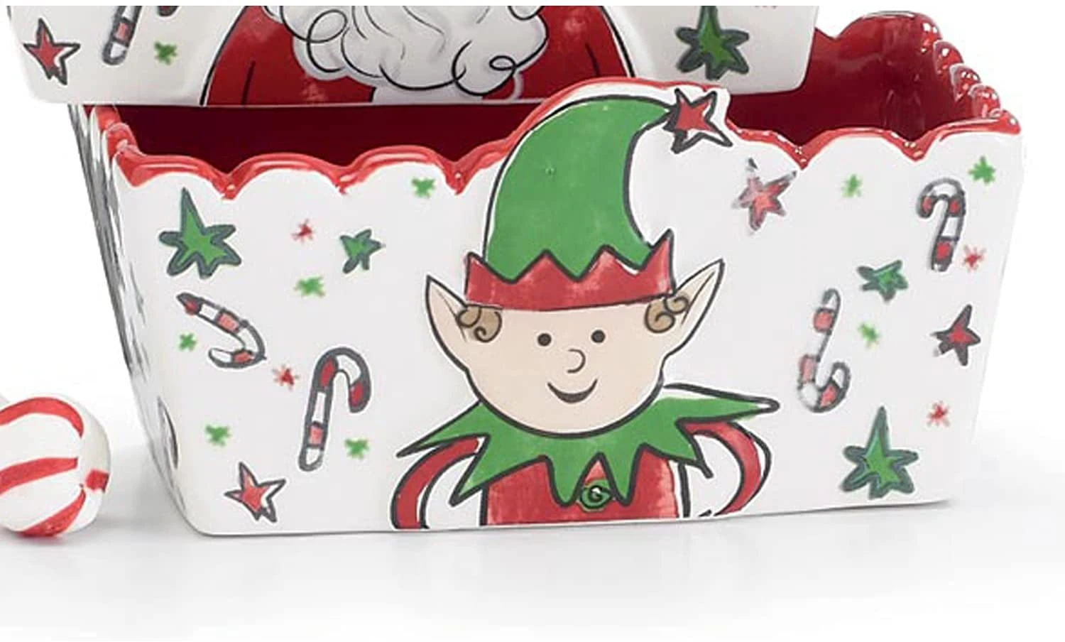 - 5.75-INCH CERAMIC HOLIDAY SERVING DISH – This delightful Christmas tableware comes in a cute jolly elf design. Its cheerful green and red candy cane patterns make it truly eye catching