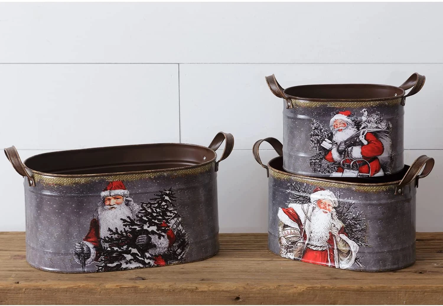 - CHARMING FARMHOUSE STYLE winter holiday decoration – Our silver metal decorative nesting tins with handles are painted with cheery vintage look Santa Claus artwork. They make for great storage and organizing bins