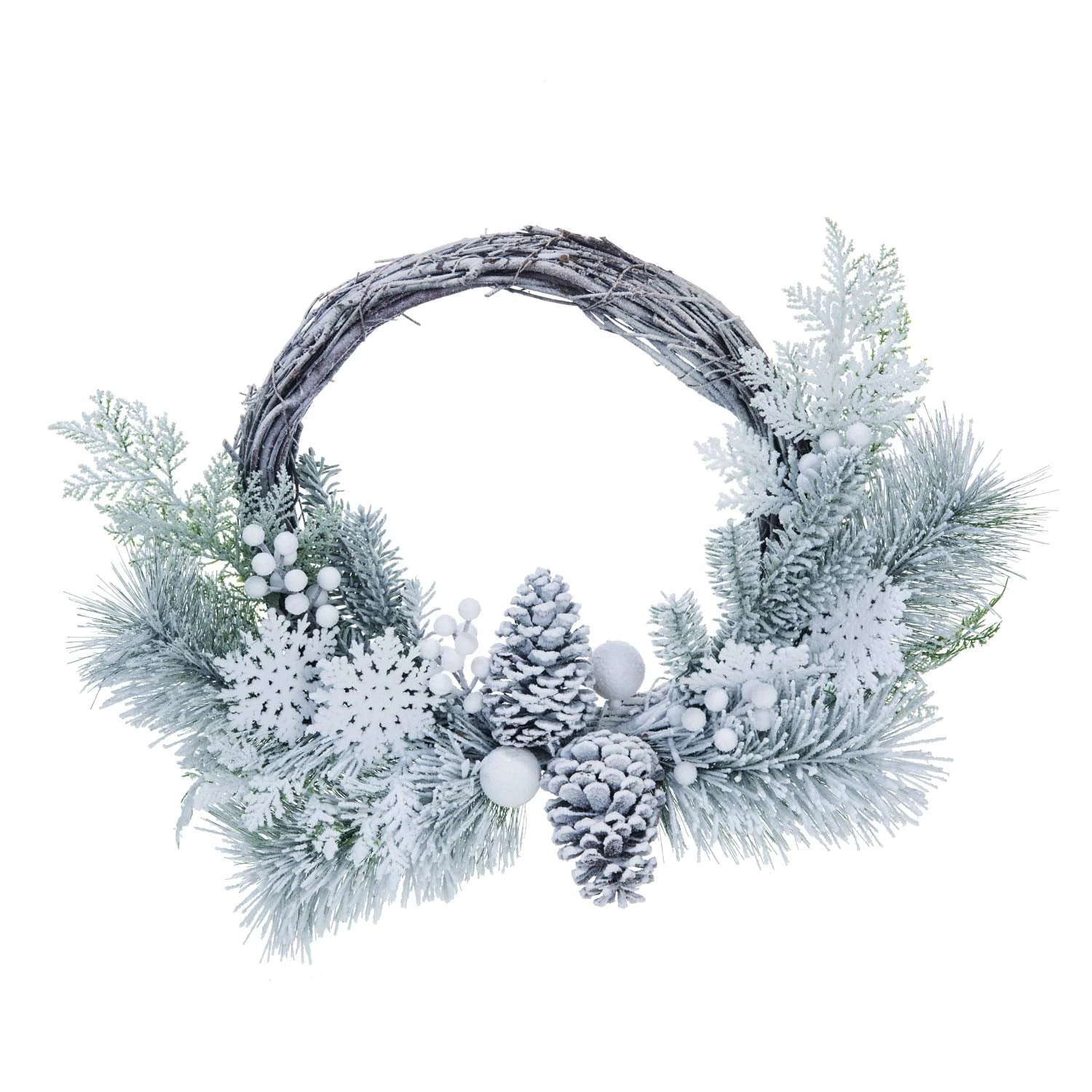 - This twig wreath is covered in a graceful arrangement of pinecones, snowflakes, and pine branches dusted in snowy white paint.