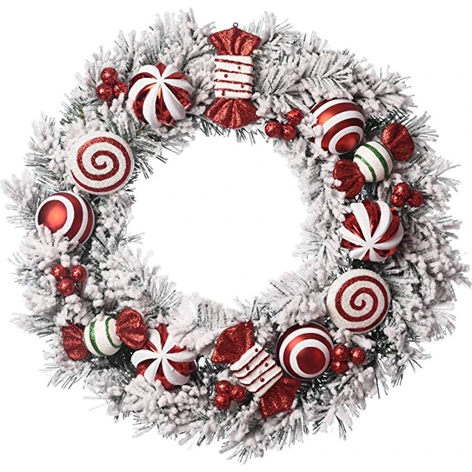 - Wreath is made of snowy white flocked faux winter greenery. Red and white striped peppermints and holiday ornaments accent the wreath