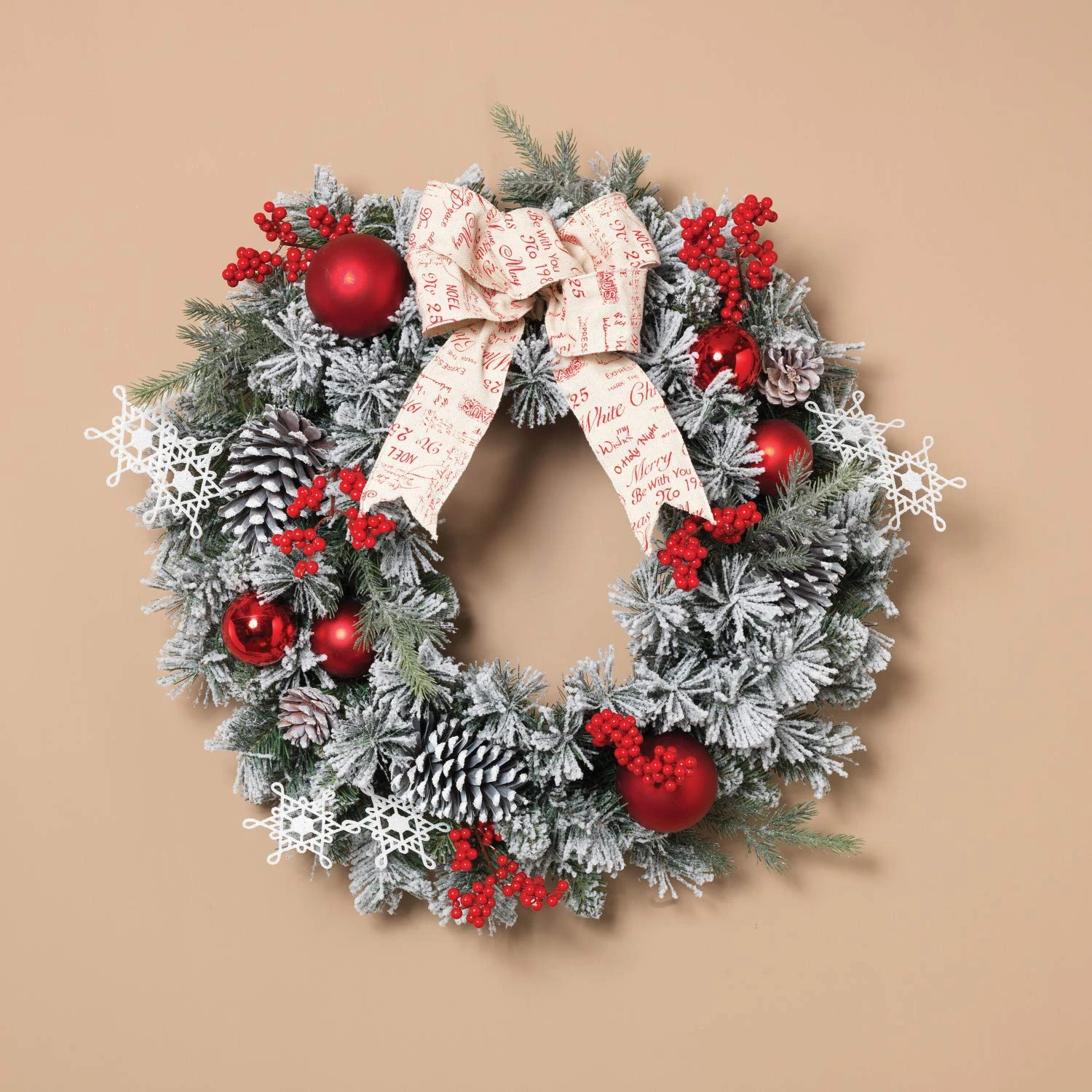 - Large holiday wreath is made up of snow-covered greenery, red ornaments and deep red berries, topped off with a holiday ribbon with Christmas phrases