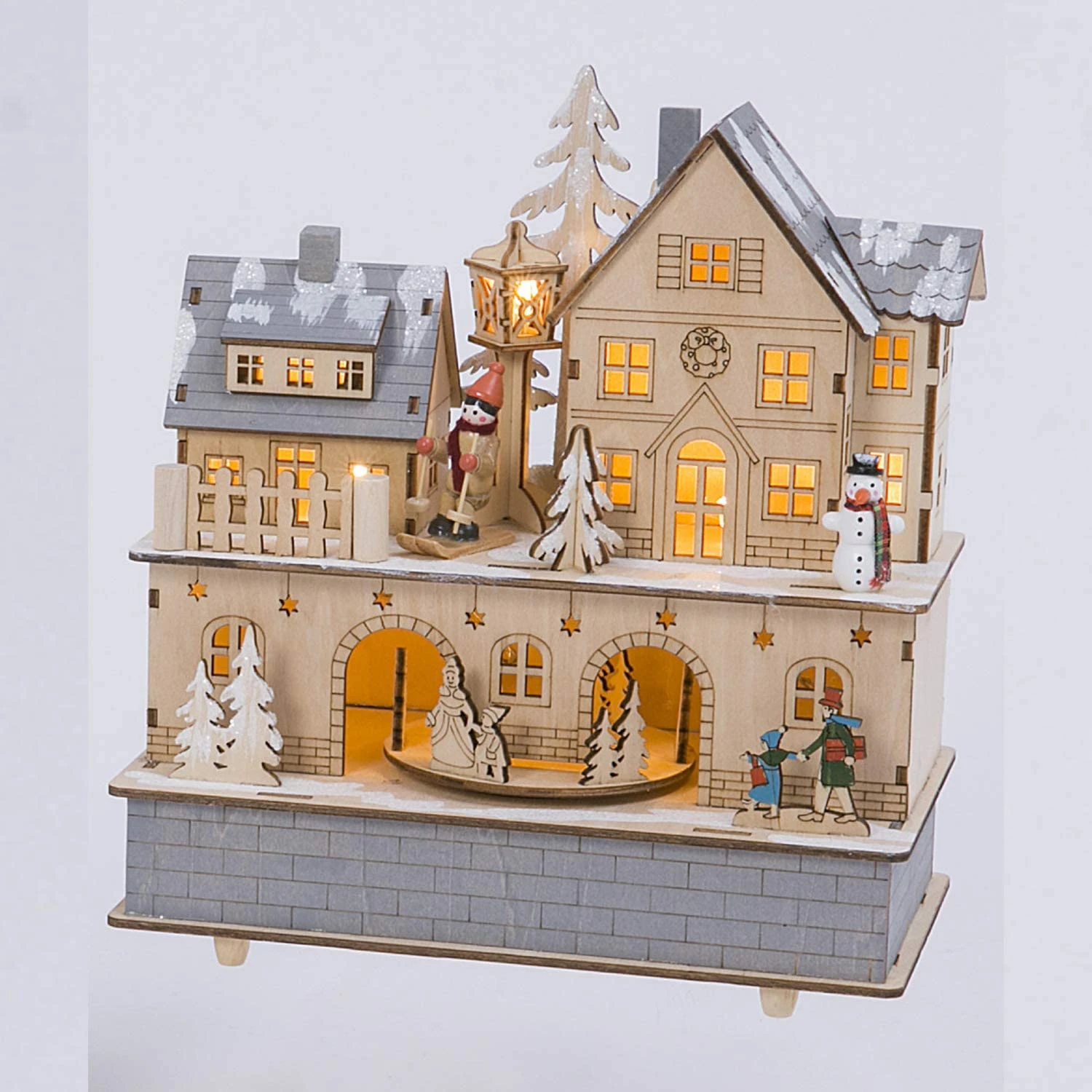 - Add a warm glow to your Christmas decor with one of our LED animated wooden Christmas village mountain town musical scenes.