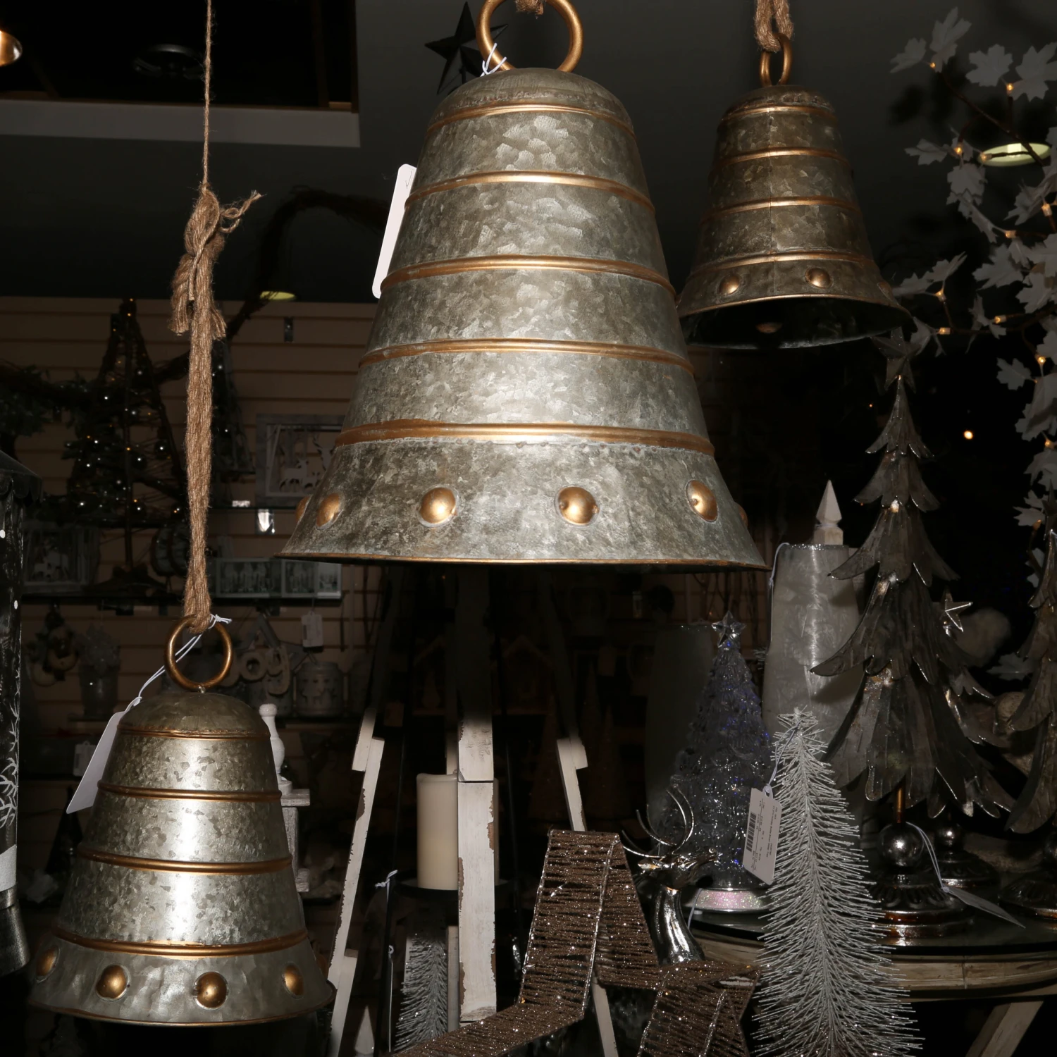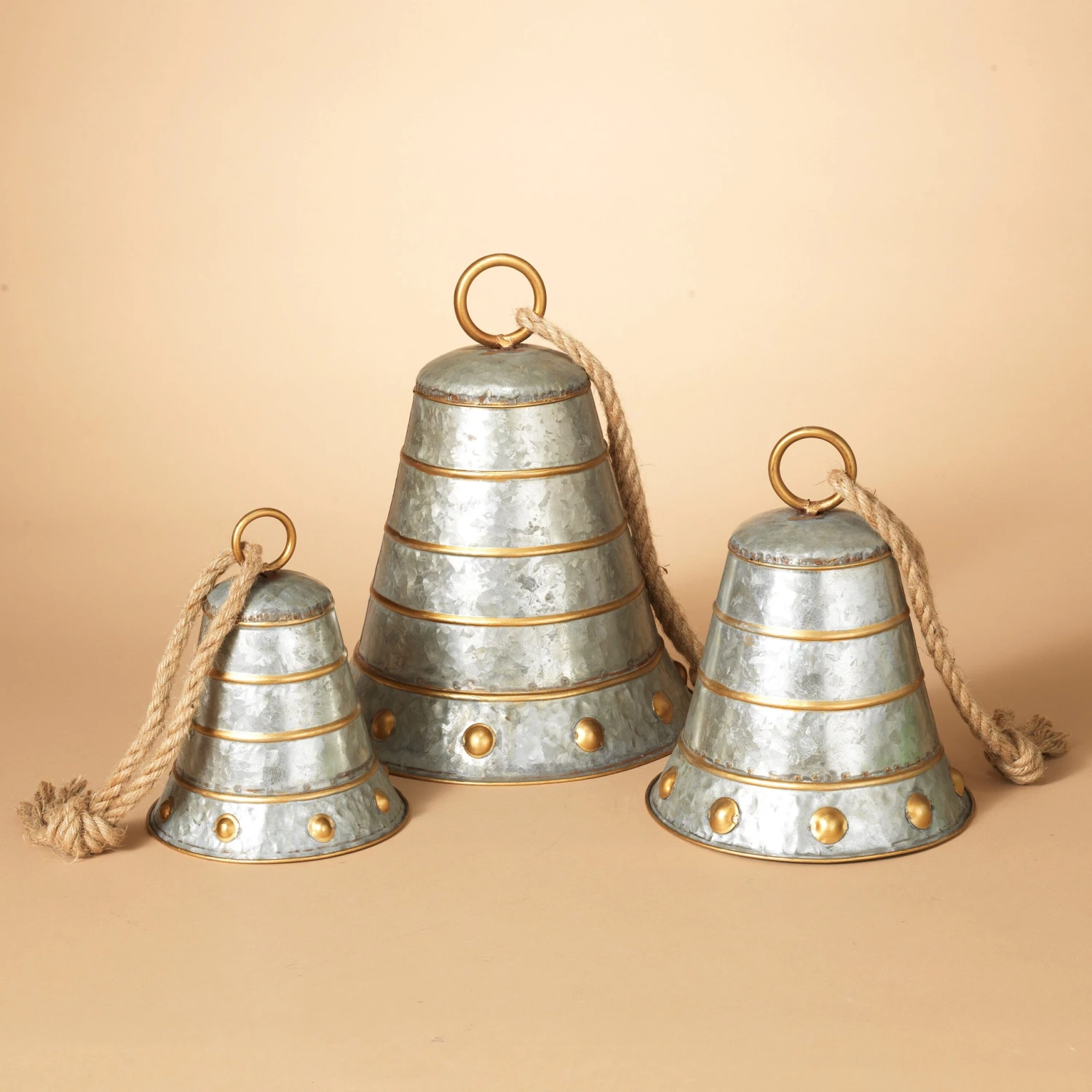 What better way to ring in the holidays than with these unique nested metal galvanized bells. These bells will add a hint of old-world elegance to your home this holiday season. Finely crafted from durable metal, each bell boasts a galvanized finish that accentuates their rustic charm. Each bell has delicate gold accents and a gold ring on top that is finely looped with twine rope for hanging. The attractive and traditional set comes in assorted sizes: large, medium, and small. Arrange on your mantel, or hang in a doorway sound off for the holidays in your own personal style.