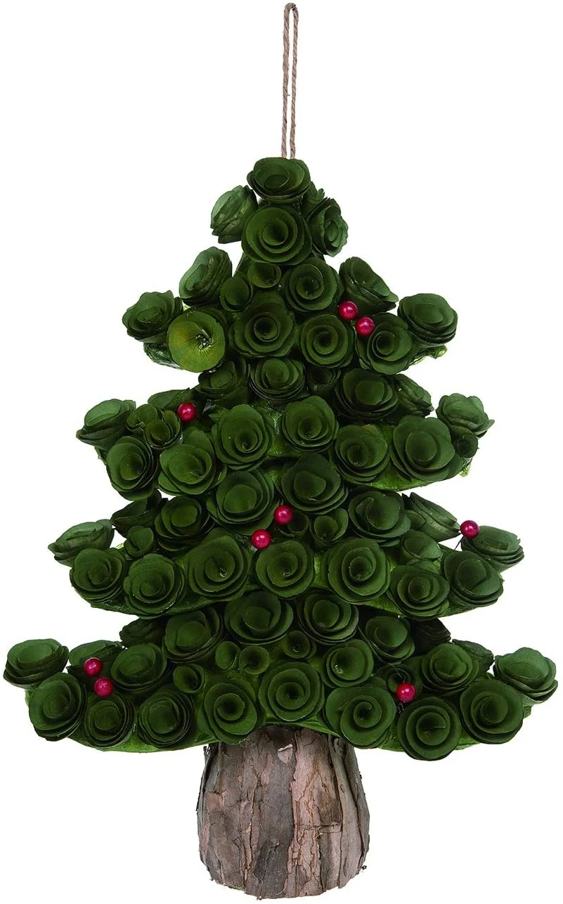 - This rustic wood curl Christmas tree features bold green wood curl rosettes with red berry accents and a natural wood trunk