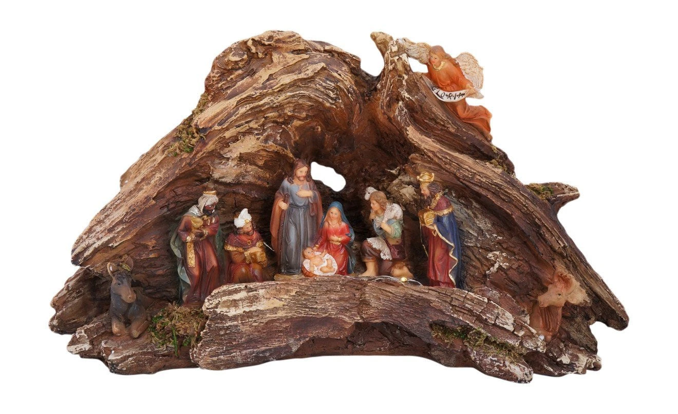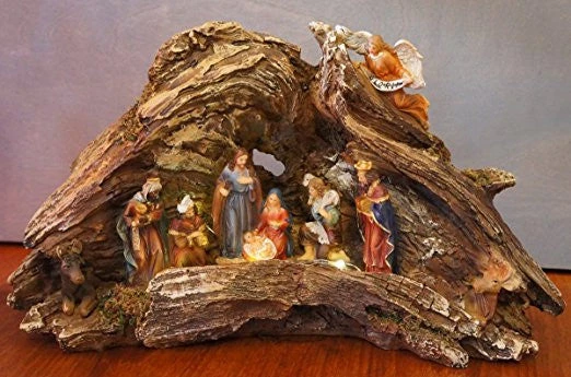 - Add a natural touch to your Christmas decor with this truly unique lighted nativity scene, which swaps the manger for a knot of wood, resembling a cave.